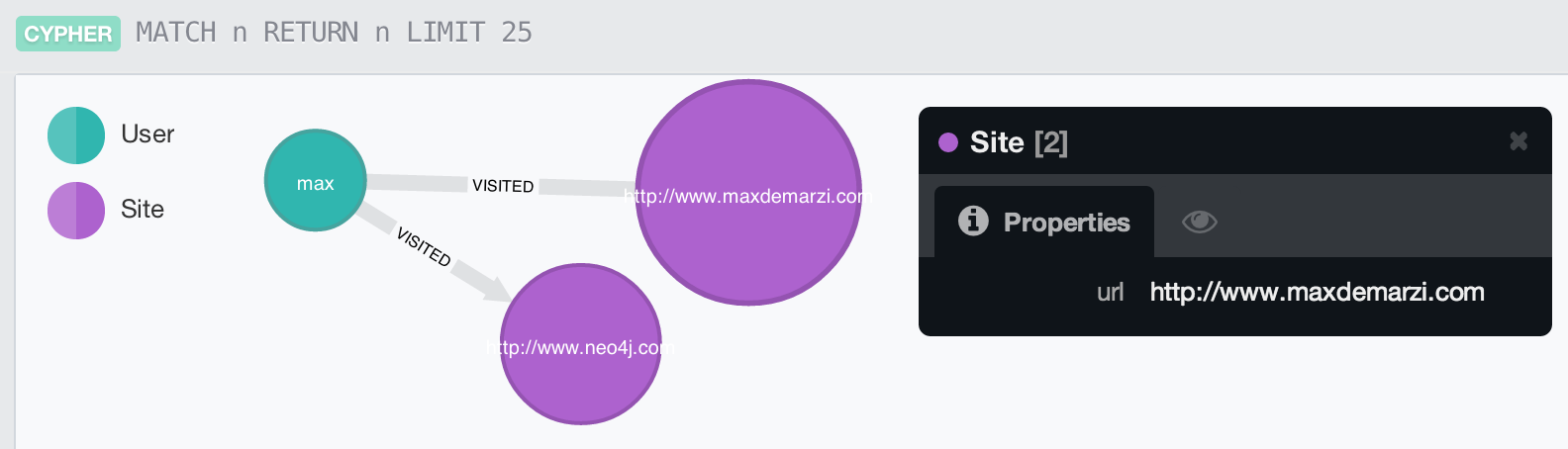 Now let’s try adding some data. In this case I will tell it that user “max” visited the site http://www.neo4j.org :