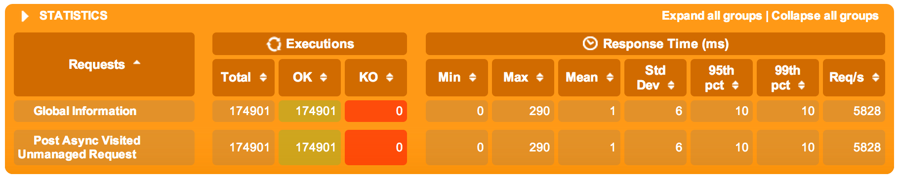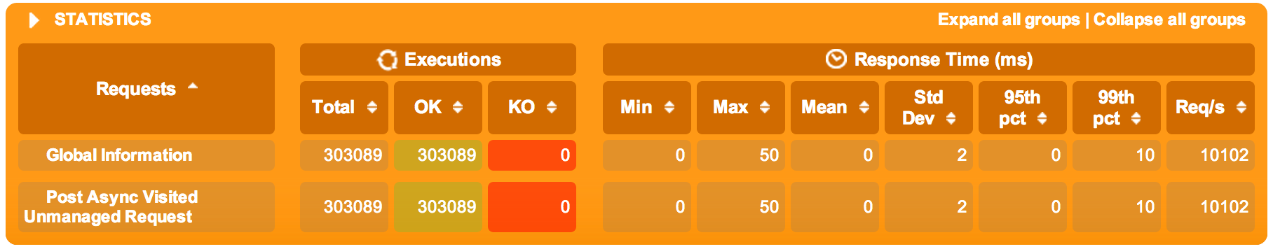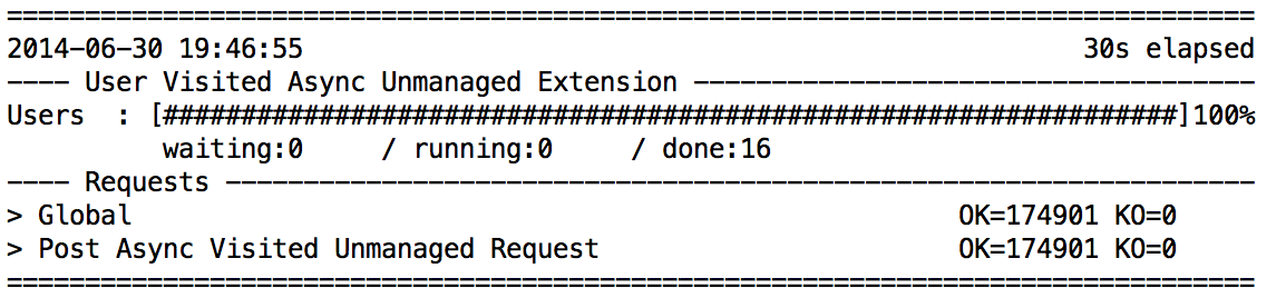 Here we see that our batch writer service received a write and performed it for us in the background. Awesome! We have the simple case working… but let’s try this with some load and compare it’s performance. First we’ll try running the synchronous version which will create a transaction for every single write. We’ll use Gatling for this performance test, the source code for the test is on github.
