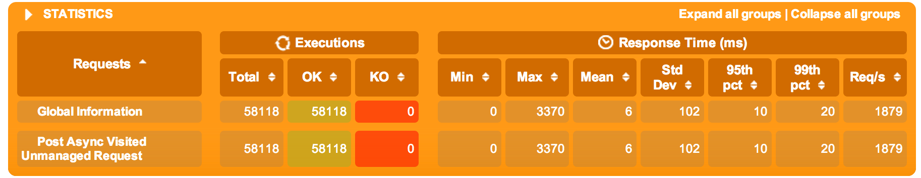 Wow look at that! No errors since it only has a single writer, so it cannot deadlock. Now we’re going at just under 6k req/s that seems pretty amazing compared to under 100 r/s! 1ms mean and a max of 290ms, but let’s see what is going on under the covers before we claim victory: