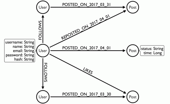 Since Neo4j is a Graph Database, we can avoid this tremendous write overhead by simply following the relationships from our user to the people they follow to their posts. A model we could use looks like: