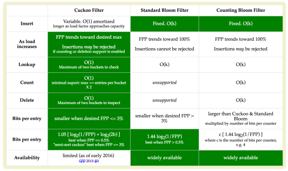 …for reasonably large sized sets, for the same false positive rate as a corresponding Bloom filter, cuckoo filters use less space than Bloom filters, are faster on lookups (but slower on insertions/to construct), and amazingly also allow deletions of keys (which Bloom filters cannot do). – Michael Mitzenmacher (2014)