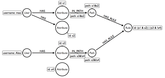 Let’s imagine we have two users. User “max” has attributes “a1” and “a2”. User “alex” just has one attribute “a3”. A rule exists that is triggered by any user that has both “a1” and “a2” in its set or alternatively has “a3” but not “a4”. I’m going to use the shorthand “&” for ANDs, “|” for ORs and “!” for NOTs. So our rule would be “(a1 & a2) | (a3 & !a4)“. We could model the data this way: