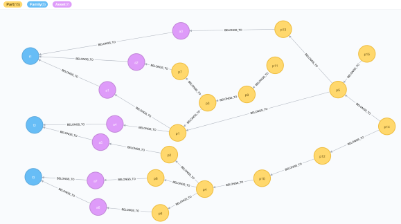 The query finds the asset with an id of “a1” and then traverses all the incoming BELONGS_TO relationships all the way to the end. That’s what the little “*” at the end of the relationship type in our query means. Knowing that some parts may belong in multiple downlines, we use DISTINCT to only see them once in our result.