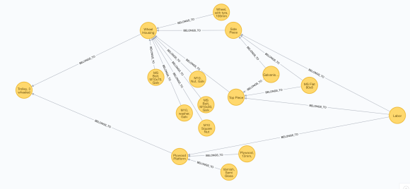 We retain the part id, description and in some cases the cost of the parts in the nodes and the quantity required as well as the measurement unit in the relationships. The full command to generate the graph is on the second file of this link and our graph looks like:
