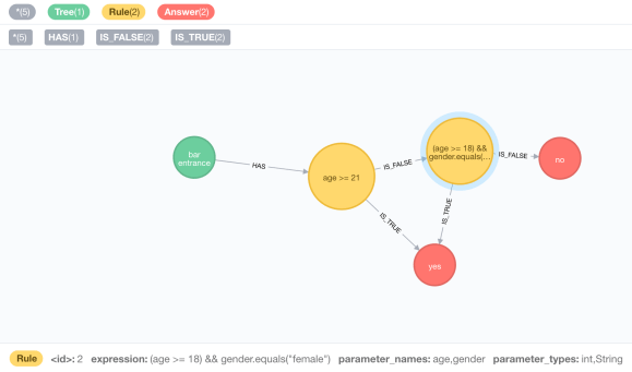 What we have here is a “Tree” node with an id property of “bar entrance” in green, two “Answer” nodes (yes and no) in red, and two Rule nodes in yellow. The first rule node asks, is the age greater than or equal to 21. It has an “IS_TRUE” relationship to the “yes” Answer node, and an “IS_FALSE” relationship to the second Rule node. The second Rule node asks if the age is greater than or equal to 18, AND the gender is “female”. It also has an “IS_TRUE” relationship to the “yes” Answer node, and an “IS_FALSE” relationship to the “no” Answer node.