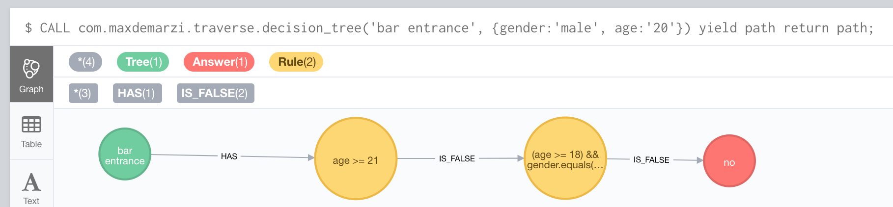 CALL com.maxdemarzi.traverse.decision_tree('bar entrance', {gender:'female', age:'19'})