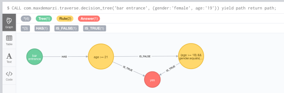 4. […] We’re actually executing this code as we’re running the traversal. We need to bring back Cypher. In this case, that is because we have to build a tree. To build a tree in Cypher, we have to create a tree node and then create some rules. The rule says over 21, the second rule is a gender rule, over 18. We have our answer nodes, and then we connect everything together. Now we have to pass in some facts to our stored procedure and see whether we fail or not. If it’s a male, 20 years old, we pass in gender male. If the male is age 20, we run this query, and it comes back with no. Sorry, you’re staying home. You’re not allowed to go into the club. Not only that, it comes back with a path, which tells us how we get to the answer of no. It went through, “Age over 21?”, nope, and then gender does not equal female. Therefore, he doesn’t get let in. Our second user happens to be a woman who is 19. We run this query, and the answer is true. She’s not over 21, but she is over 18 and a woman. Therefore, she is allowed in. What this has done is taking code as data. This is deliverable to an end user, and the query ran in real time. This use case came from a project where users were building pharmaceutical drug recommendations. These drug recommendations were based on research. The research comes out every quarter, and they have the decision tree of what drug do I give someone based on all the evidence and relevant medical papers. There is a group of doctors who were analyzing this data and building a decision tree based on it. These guys were doing it by hand through just expert knowledge. However, there are other ways to build decision trees. […]