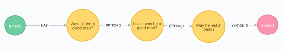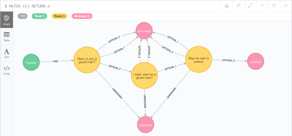 In Neo4j, we will create a new Tree node and call it “funeral”, 3 new Answer nodes (correct, incorrect, and unknown), and 3 Rule nodes, one for each question. It will look like this: