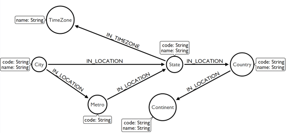 A while back I showed you how to import the Cities database from MaxMind using an extension and then once more using a Neo4j Stored Procedure. That model if you recall looked like this: