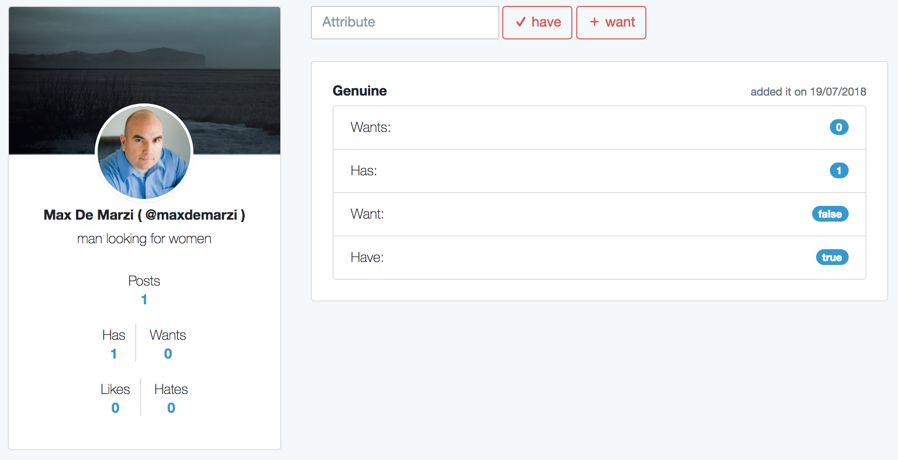 I’ll spare you the code, but the WANTS relationship is just a mirror image of what we built just now. Let’s hook it up back to our application. First we need a model for Attribute: