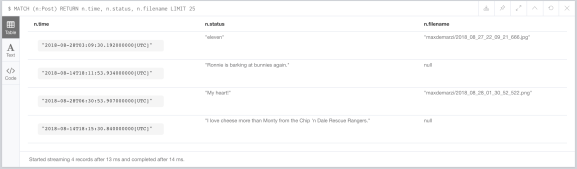 MATCH (n:Post) RETURN n.time, n.status, n.filename LIMIT 25