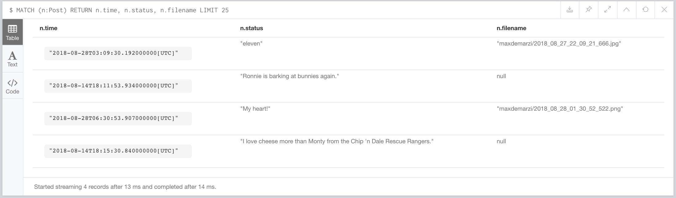 MATCH (n:Post) RETURN n.time, n.status, n.filename LIMIT 25