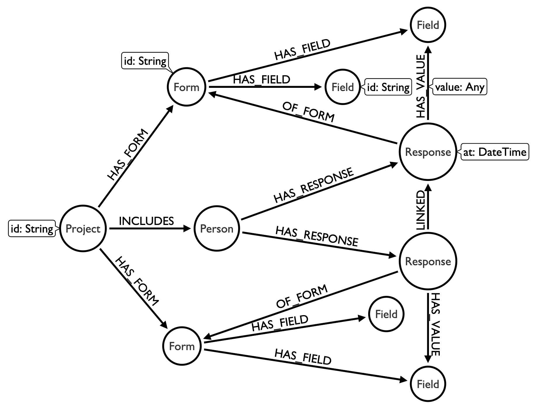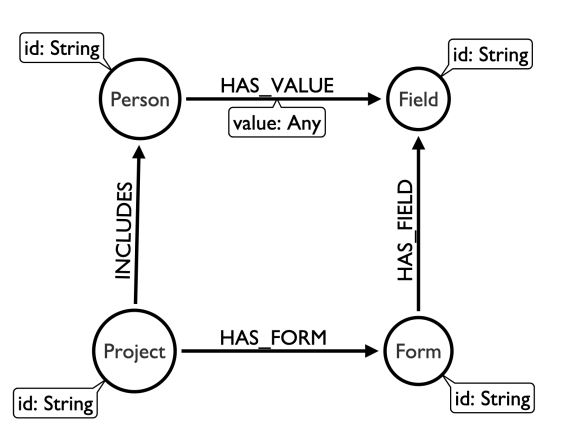 Let’s create a model for this data. From the description of the application, we need a few kind of nodes: Project, Form, Field, and Person. The Project has People and Forms, the Forms have Fields, the Person has Values. Let’s tie these together: