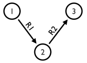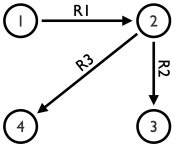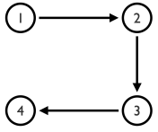 Ok we have a problem here. Cypher is written in a single dimension, and we can only connect a node to two other nodes, but in this motif node 2 needs to connect to both node 1, node 3 and node 4! So what can we do? Well in Cypher we can use the comma as an “AND” to signify that the pattern continues. The cypher in this case is: MATCH (n1)-[r1]-(n2)-[r2]-(n3), (n2)-[r3]-(n4)