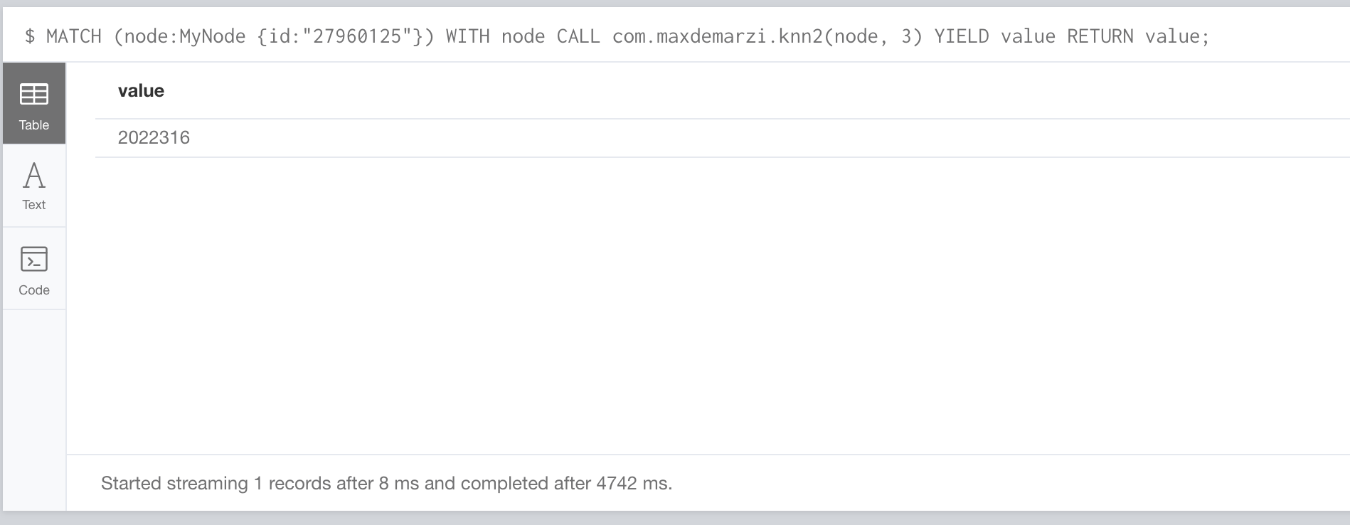 Let’s compile our plugin, add it to the plugins folder of Neo4j, restart and try our query again: