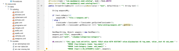 In the real procedure I expect the xml file to be in the Neo4j “import” folder which means we can just grab it via “file:///weapons.xml”. For testing however we don’t really get a chance to copy this file over to the in memory TestServer that gets built. To get around this, we’ll put in a test parameter and get the file from the resources folder if it’s set.