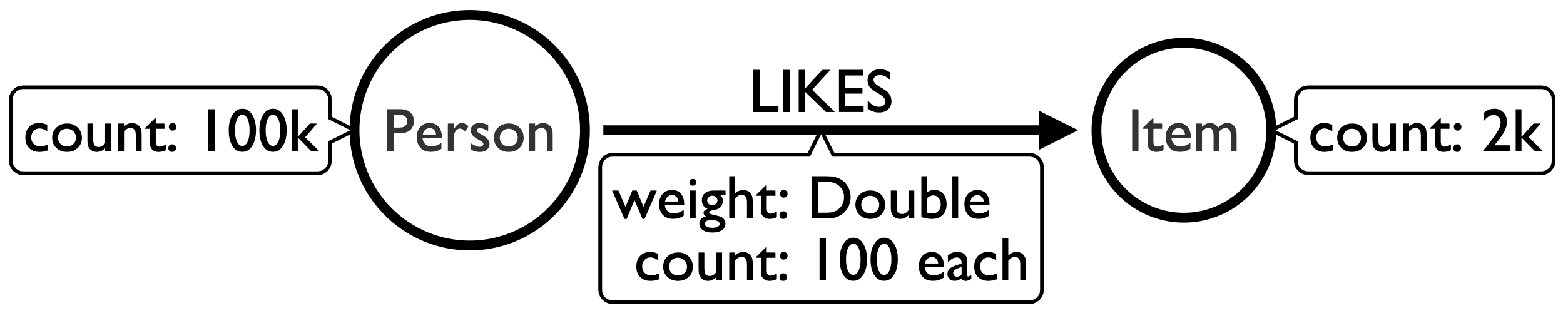 Alright, let’s start with the setup. I’m testing on my Mid 2015 Mac Book Pro while a bunch of stuff is running in the background, so this is not meant to be super scientific, just ballpark type measurements. I’m going to be comparing apples to oranges on purpose, so don’t get wound up about that. Exactly like how most vendor published benchmarks are done. We’re going to have a very simple graph with just two kinds of nodes: Person and Item. We’ll have 100k Person nodes and 2000 Item nodes. We’ll have just one type of relationship “LIKES”. Each Person will have 100 Outgoing LIKES to Item Nodes, which means each Item node will have approximately 5000 Incoming LIKES. Each LIKES relationship will have a single property “weight”. It will be a random Double between 0 and 10.0. For the more visual of you, it looks like this: