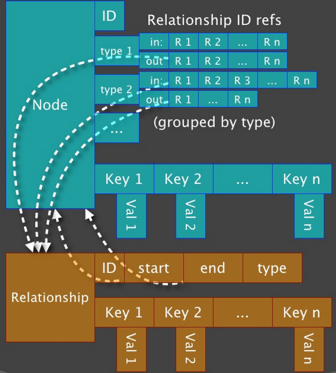 To make things easier to visualize the internals of Neo4j, I often refer people to this image: