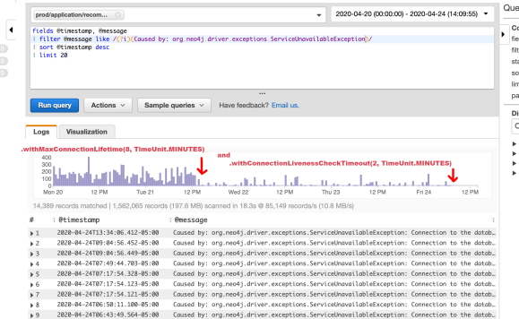 But… the driver and the application weren’t really expecting so much turbulence. I gave the Aura team a sample database and application that mimicked the customer workload and they came back with two configuration suggestions. First, don’t let any connection linger for more than 8 minutes. There are processes that currently automatically close them at 10 minutes, so there was really no point going longer than that.