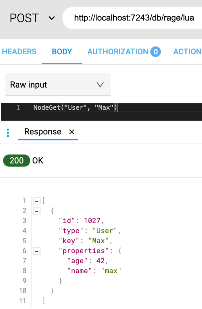 We’re going to create a couple of User nodes (Max and Helene) and add a LOVES relationship between them. Now let’s retrieve them by sending NodeGet(“User”, “Max”) in the body of a POST request to /db/rage/lua: