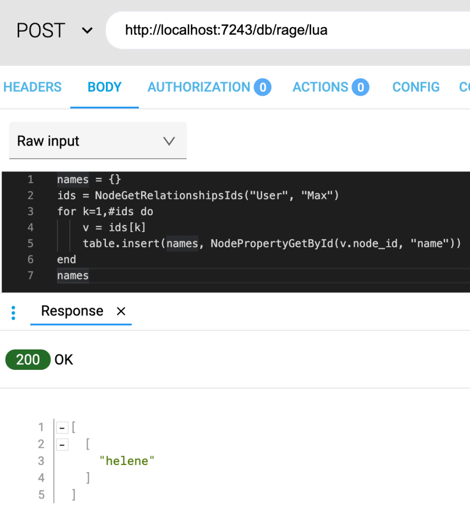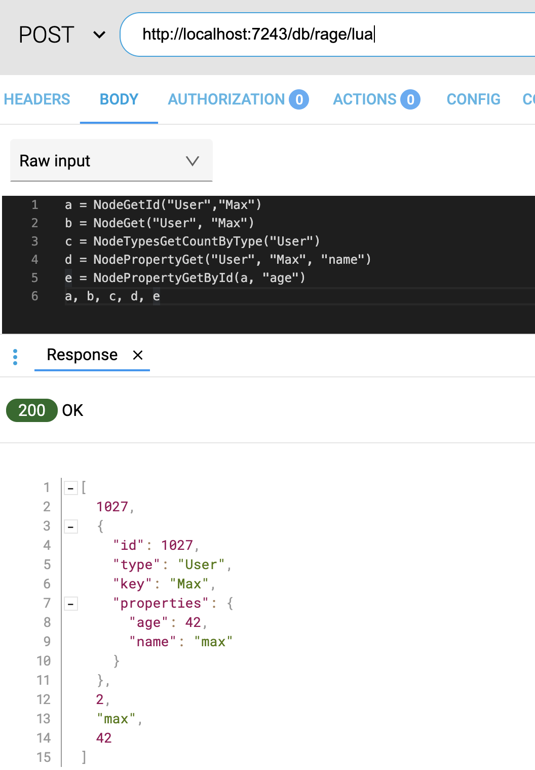 So instead we’re letting users talk to the graph directly using Lua. How is this going to work you may ask. Well, we first start off with an endpoint: http://localhost:7243/db/rage/lua that takes a POST with a string of Lua code.