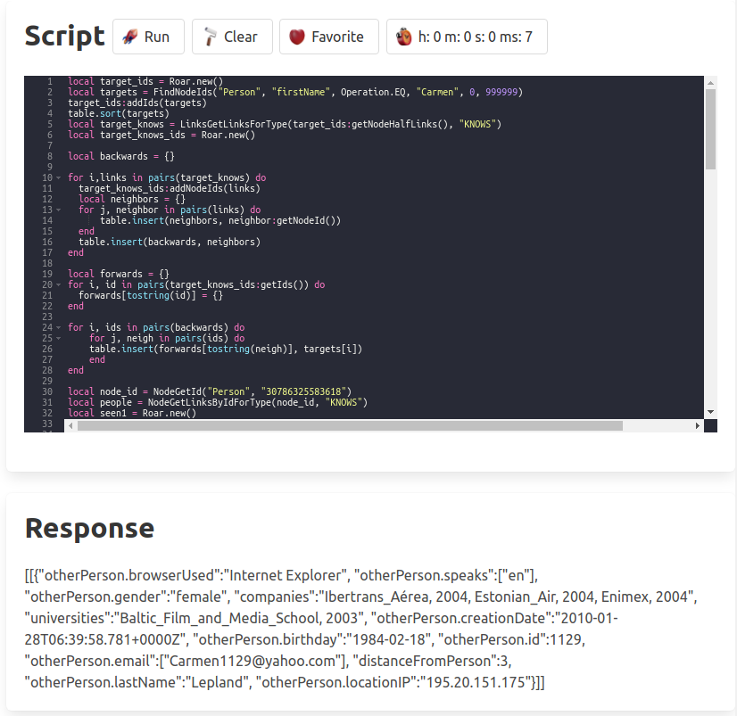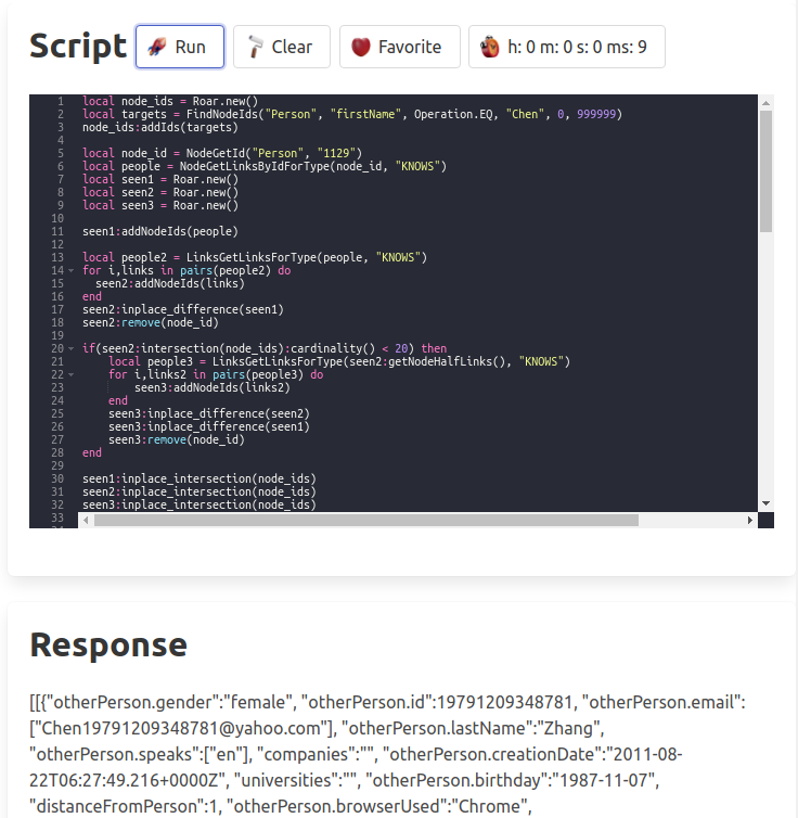 Ok, so that’s a bit of a monster coming in at about 100 lines. Half of it is formatting, sorting and random nonsense so it wasn’t really that bad. So what do we get for our efforts on the LDBC Social Network Size 10 dataset for parameters 1129 and “Chen” for the name?