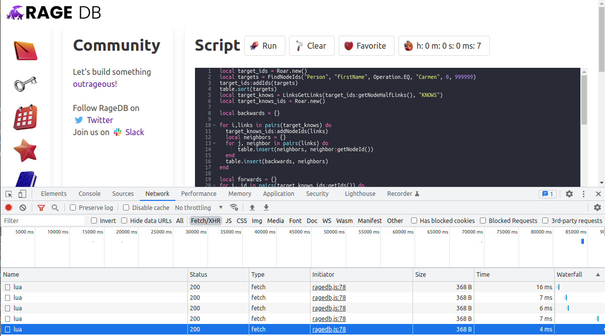 You may have noticed a little “clock” on the Rage DB UI that lets you know how long it took to run the query. This functionality is purely browser side. I am using the Performance Timeline specification to capture the duration of requests sent to the “lua” endpoint.
