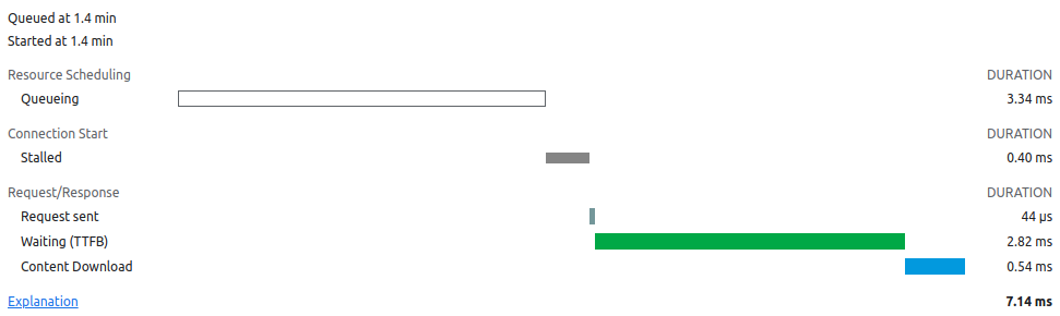 If you click on any of the requests you can get more fine grained details from the browser. We’re just capturing the final duration rounded off. Notice in this case our query started returning an answer in under 3 ms, but the overall duration was 7 ms due to queuing.