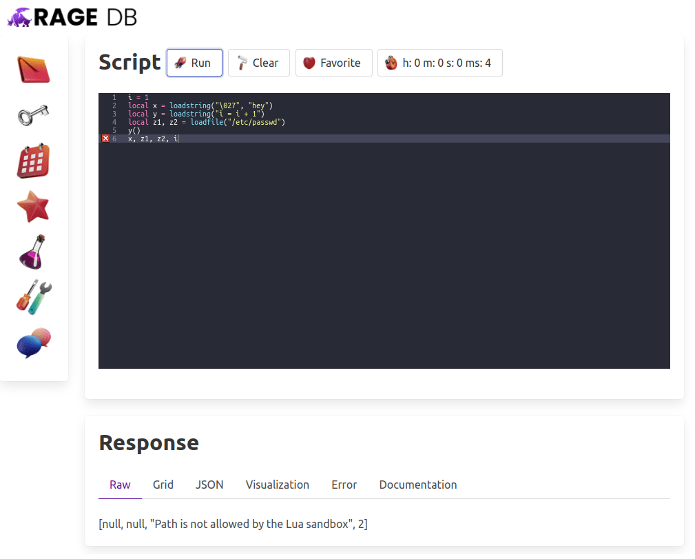 The idea of using a programing language as the way to write queries against the database makes many security folks hyperventilate. In order to lower their heart-rate and slow their breathing we have to limit the queries using a technique known as “sandboxing“. The Sol2 library we are using in RageDB lets us create an “environment” where our queries will run. Let’s see how we go about doing this.