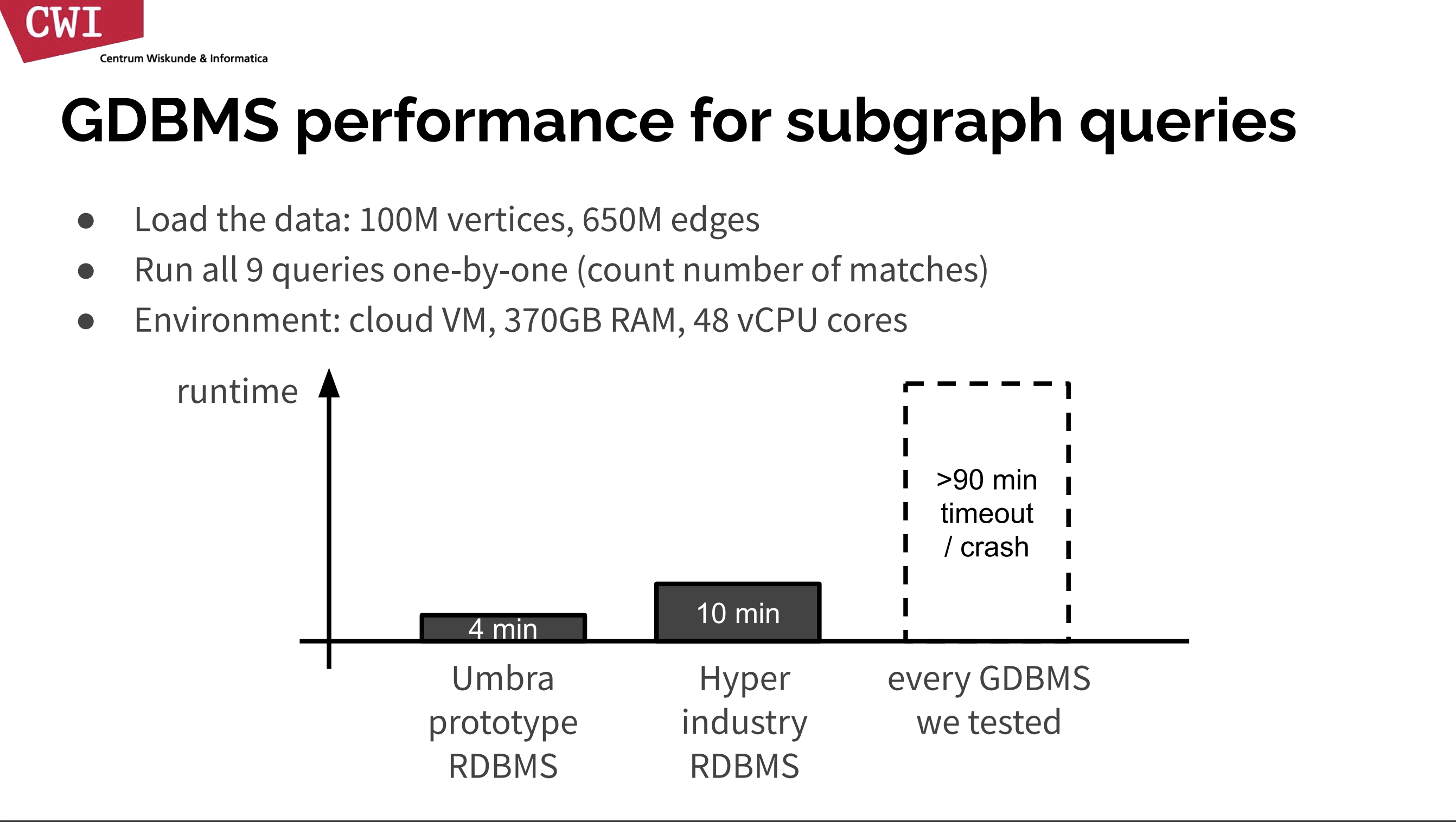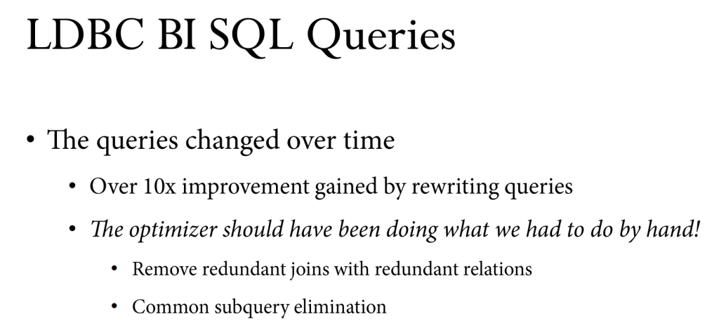 The people who will end up being users of Umbra (or any database really) will on average never be as capable of this feat as the creators of the database. Think about it. 10x. The queries ran ten times faster by knowing the right incantations to type to this “declarative” language. That defeats the whole purpose. If you take the 10 minutes Hyper took and multiply it by 10, then you are at 100 minutes…. and over the 90 minute timeout in their test.