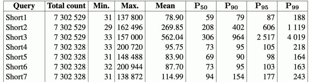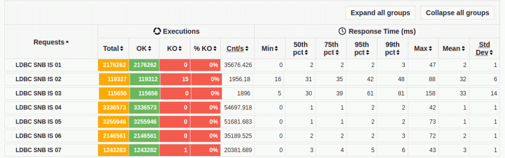 At the top end of requests per second, we get LDBC SNB IS 04 with 54,697. Next is IS 05 not far behind. That is because these two queries are really simple. IS 04 just returns a Message node. IS 05 returns some attributes of the Person that created a message.