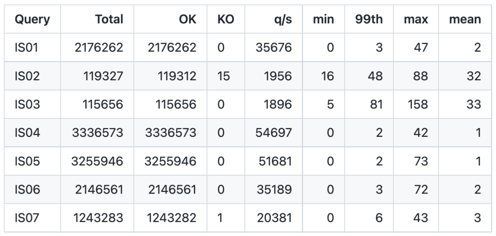 It seems TuGraph is probably precomputing the results ( I don’t know, it is not mentioned in the audited report or I missed it). But isn’t it weird that they managed to be 10 times slower on the mean of these queries vs GalaxyBase but still come out on top? Maybe it’s because GalaxyBase maxes are insane. If your mean is 78 microseconds and your max is 137,800 microseconds something is clearly wrong.