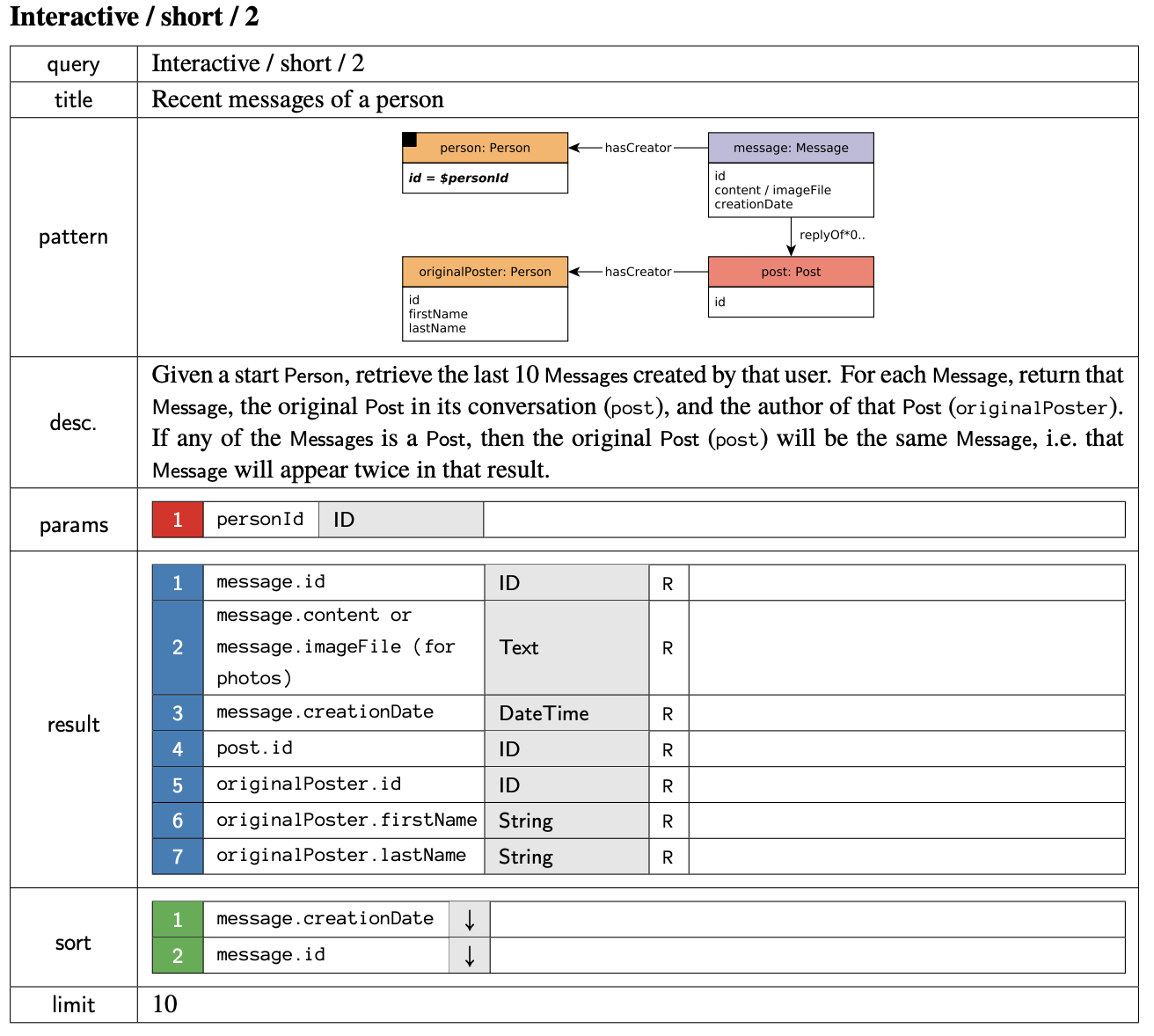 At the bottom of the requests per second, we get LDBC SNB IS 02 and 03. When we take a look at IS 02, we can see that it does much more work than 04 and 05. It starts at a person node, then retrieves the last 10 messages that person created and the author of the Post which could be that themselves or it may be someone else if that message was a Reply of a Post or a Reply of a Reply of a Reply, you get my point: