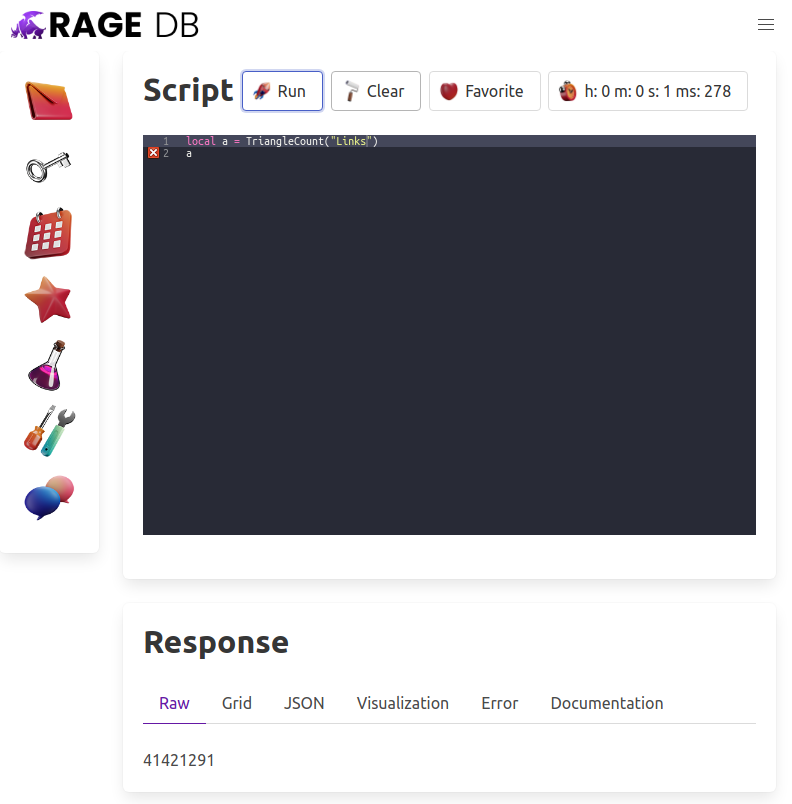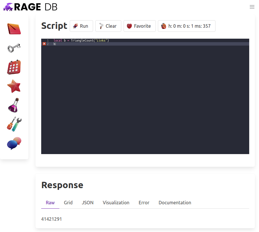 So was it worth it? Did the Count’s advice actually help us achieve our goal of beating Kuzu at 1.62 seconds? Oh yes! Rage is able to count these 41 million triangles in 1.357 seconds. Still, I wish I could do the IntersectIds (which is just std::set_intersection ) method in Lua directly. Maybe in assembly? Hit me up if you know how. UPDATE: We can do better. Read below…